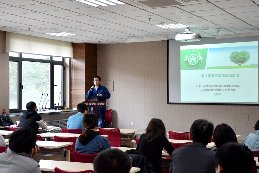 午餐会上,山东大学齐鲁医院呼吸与危重症医学科、山东大学呼吸监测与支持研究所马德东医生作了关于“秋冬季节呼吸道疾病防治”的报告。报告先简要介绍了秋冬季感冒多发原因。接着从普通感冒、流感、肺炎三种主要秋冬季节呼吸道疾病展开报告。在普通感冒方面,马德东介绍了如何区分普通感冒与流行性感冒、区分普通感冒与过敏性疾病,以及缓解感冒症状的方法。他特别指出,普通感冒大部分是由于病毒引起,不要滥用抗生素。在流行性感冒方面,马德东医生从如何判断是否得了流感、易得流感的人群、得流感的后果、如何预防流感、流感的治疗五个方面展开详细介绍,并补充说明了流感疫苗的选择及口罩的选择和佩戴相关知识。他指出,流感季节尽量不要熬夜,睡眠的剥夺对免疫力是巨大的打击。此外,马德东医生还介绍了肺炎的常见症状及其他表现。报告结束后,参会老师就报告中的有关问题与马德东医生进行了深入交流与探讨。